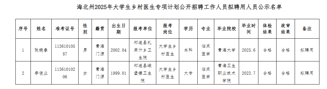 根據(jù)《青海省2025年大學(xué)生鄉(xiāng)村醫(yī)生專項(xiàng)計(jì)劃公開招聘公告》及相關(guān)政策規(guī)定,海北州2025年大學(xué)生鄉(xiāng)村醫(yī)生專項(xiàng)計(jì)劃公開招聘工作人員筆試、面試、體檢、考察政審已經(jīng)結(jié)束,現(xiàn)將擬聘用人員的個人信息進(jìn)行公示,公示期為2025年12月19日至12月25日(共7天)。公示期間,如對擬聘用人員有異議,請以來電或書面形式反映,反映情況時應(yīng)署真實(shí)姓名和聯(lián)系方式,匿名反映不予受理。
