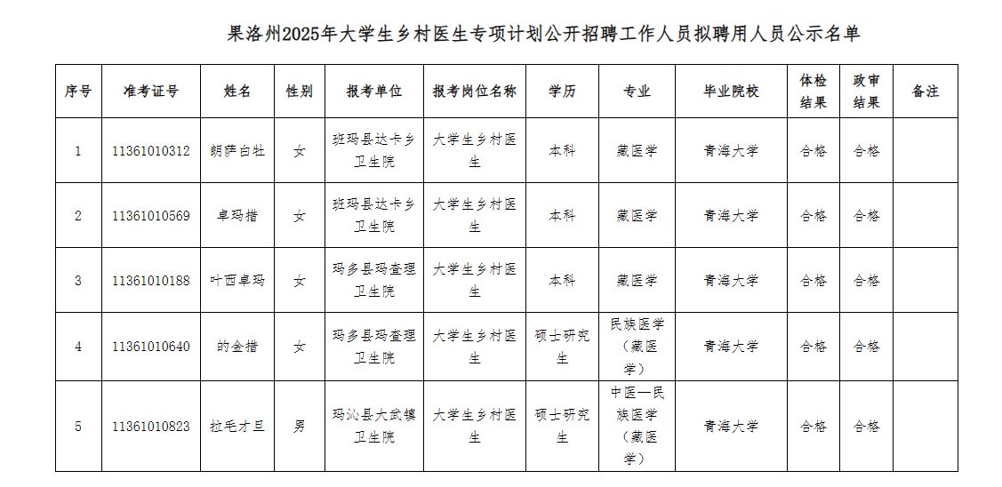 果洛州2025年大學(xué)生鄉(xiāng)村醫(yī)生專項(xiàng)計(jì)劃公開招聘工作人員擬聘用人員公示